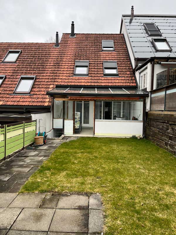 Das Reiheneinfamilienhaus verfügt über ein Untergeschoss, ein Erdgeschoss und zwei Dachgeschosse und zwei seitig Garten und Sitzplatz. Beim Gebäude wurden die orginalen Fenster aus den 90er Jahren ersetzt und die Einteilungen angepasst. Es wurde eine Lebenszyklus-Analyse der bestehenden Gebäudeteile in besonders der Haustechnik durchgeführt. Damit das Gebäude über die Jahre hinweg saniert und renoviert werden kann.
